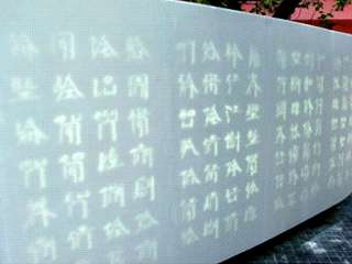 《英文方塊字》是一種看起來像中文,但實為英文的新的書寫形式。使參與者獲得一種從未有過的經驗。在這種既熟悉又陌生的轉換中,人們對文化的舊有概念受到挑戰,從而打開更多思維的空間,以找回認知的原點。白天看上去,這件作品是一塊沒有任何內容的白色的牆體,隨著太陽落山,牆體逐漸顯現出發光的《英文方塊字》的"馬照跑"全詩的內容。