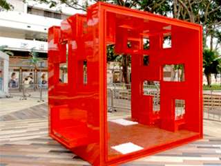 《紅盒子》座落於婆娑樹影下,它是一個配合環境的立方體,又是一座讓人輕鬆休憩的亭子,它與樹蔭作安寧對話而產生共鳴,代表了人和大自然之間和諧的結合。